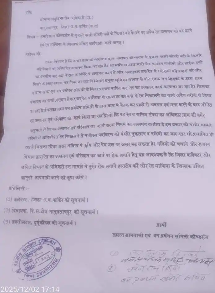 ग्रामीणों ने आरोप लगाया है कि कोण्डरुन ग्राम से होकर बहने वाली कोटेरा नदी के किनारे रेत माफिया बड़े पैमाने पर अवैध उत्खनन कर रहे हैं। इस संबंध में ग्रामवासियों ने अनुविभागीय अधिकारी राजस्व, भानुप्रतापपुर को लिखित शिकायत सौंपकर तत्काल कार्रवाई की मांग की है। शिकायत में कहा गया है कि माफिया रात के अंधेरे में चैन-माउंटेन मशीनों और हाईवा ट्रकों का उपयोग कर भारी मात्रा में रेत निकालते हैं और इसे अवैध रूप से सप्लाई किया जाता है।